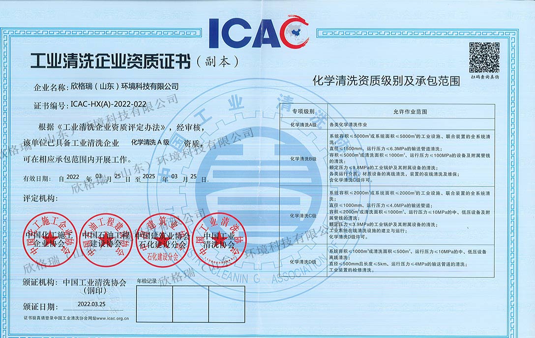 工業(yè)設(shè)備清洗單位能力證書(shū)(A級(jí)化學(xué)清洗)