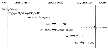 石灰石-石膏濕法煙氣脫硫系統(tǒng)中涉及以下三個(gè)過(guò)程:石灰石溶解,二氧化硫吸收,亞硫酸鹽氧化為硫酸鹽。所涉及到主要化學(xué)反應(yīng)式如下: