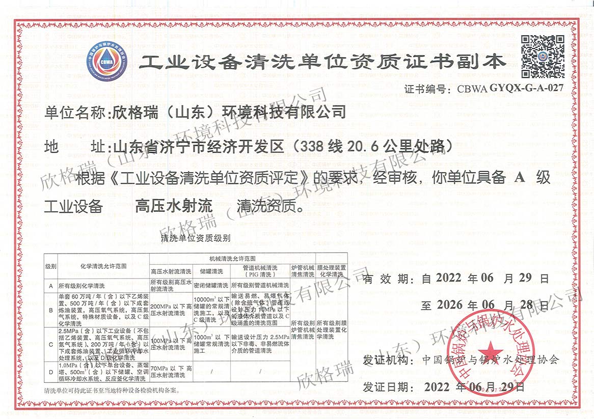工業(yè)設(shè)備清洗單位能力證書(A級高壓水)